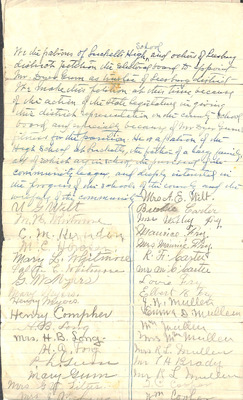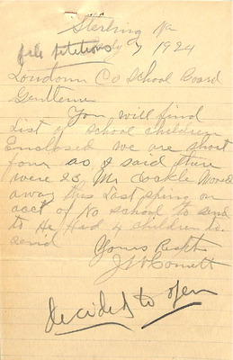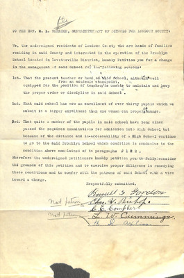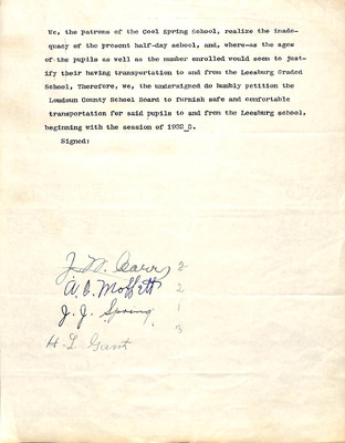 February 9, 1924 petition from patrons of Bluemont students attending Round Hill High School for school bus transportation.