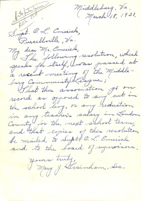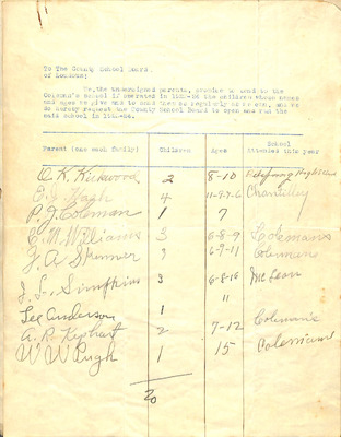 EWP 2-5-B Yr 1931 Sept Petition 69 Airmont Opposition to Colored Using School Room Sept. 14, 1931 - Petition from Carl Wynkoop to the Loudoun School Board to opposed to the African American students using the Airmont white school room. The school system contemplated allowing African-Americans to use the former Airmont school, which was closed by the time of the petition. Hearing that, one of the patrons, apparently from Round Hill protesting this possibility. We have no information that the contemplated plans were executed.