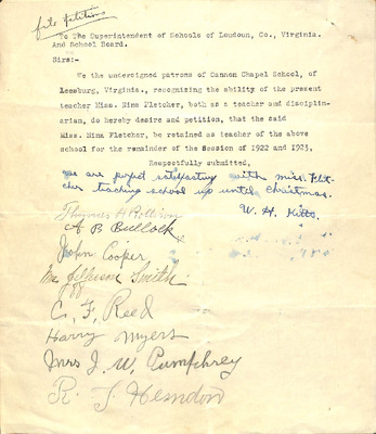 In this letter, the white community members and patrons of the Cool Spring School in Loudoun County are petitioning the Division Superintendent of Schools and the County School Board to reconsider a decision to reduce their school to a half-day basis. They argue that the pupils of their school deserve the same educational opportunities and advantages as other schools in the county. They also express concern that reducing the school's hours would hinder community social events that the resident teacher usually organizes. The patrons highlight the challenges of impassable roads and expensive transportation, arguing that maintaining a full-time teacher is necessary for the children's education and community's involvement with the school. The list of signatories at the end of the letter demonstrates widespread community support for this request.