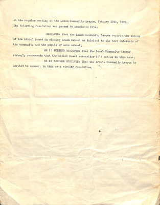 EWP 2-5-B Yr 1928 Lenah Protests Closing The resolution passed by the Lenah Community League on February 20th, 1928, regarding the closure of Lenah School by the School Board reflects the community's strong opposition to this decision. The resolution, supported by numerous taxpayers and patrons of the school, not only criticized the Board's action as detrimental to the community and the students, but also urged the Board to reconsider its decision. The involvement of the Arcola Community League in potentially concurring with this resolution indicates a broader community effort to challenge the closure of Lenah School. The list of signatories, including prominent local individuals, highlights the widespread opposition to the School Board's decision and the united front put forth by the community in advocating for the school's preservation.