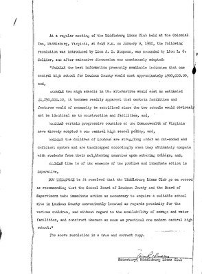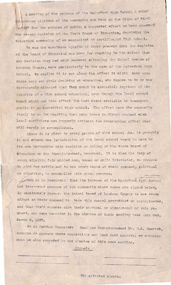 EWP 2-5-B Yr 1930 Waterford Protest that Waterford will not be an accredited High school At a meeting of the citizens of Waterford, Va. and community, on March 13, 1930 called for the purpose of discussing the proposed changes contemplated being made in our schools of Loudoun County, after receiving a copy of the recommendations from the County Survey Committee, the following Committee was appointed to act in behalf of the Waterford High School as they may deem fit. Rev. John A. Bowman, Talbot E. Pierce, William S. Smoot, Douglas N. Myers, W.I. Mann, James Carr. C.N. Mason, R.E. McCarty, Frederick Stabler, immediately after the adjournment of this meeting the above named Committee met and formulated the following appeal to the School Board of Loudoun County, at its meeting to be held on March 18, 1930 in the School Auditorium at Leesburg, Va. (1) We respectfully appeal to you to keep the Waterford High School on the accredited list of high schools. Here is a good school, fully equipped and serving well a rural community, which enjoys none too many advantages. It would be a step backward in education to take away a high school that has been established over twenty years and deprive the pupils of the advantages they are entitled to have, and for which we pay taxes. Gov. Pollard recently said "Education is the foundation of the whole state, to be exercised for the benefit of all children within its borders. The Waterford High School is not to blame for having under thirty-five pupils this year. We now have an excellent Principal and good teachers. We have reasons to know that if allowed to continue as at present, we will have the allotted number of pupils for the school term 1930-31, (2) We suggest a zone system and recommend that children in these zones attend their respective schools. (3) We are opposed to the consolidation of schools, and bus transportation as morally detrimental to the children of any community But in event consolidation of smaller schools is more fully carried out. we urge that the schools at Wheatland, Paeonian Springs and Clarks Gap, be consolidated with the Waterford school. (8) For the educational benefits of Loudoun and its present and future welfare we are unanimously opposed to the practice of employing an itinerant teacher. Respectfully submitted. Rev. John A. Bowman, W.S. Smoot, ( (Committee) W.I. Mann, C.N. Mason, R.E McCarty, Fredk. Stabler, Talbot E. Pierce, Douglas N. Myers, James Carr.