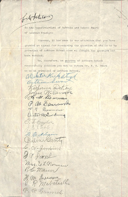 EWP 2-5-B Yr 1928 Ashburn High School wants to keep N.C. Starke In this letter, addressed to the County School Board of Loudoun County, Virginia, the undersigned patrons of Ashburn High School express their request for the reappointment of Mr. N.S. Starke as principal of the school. The list of signatories paints a picture of community support for Mr. Starke, with a diverse range of individuals including parents, teachers, and other community members advocating for his return.